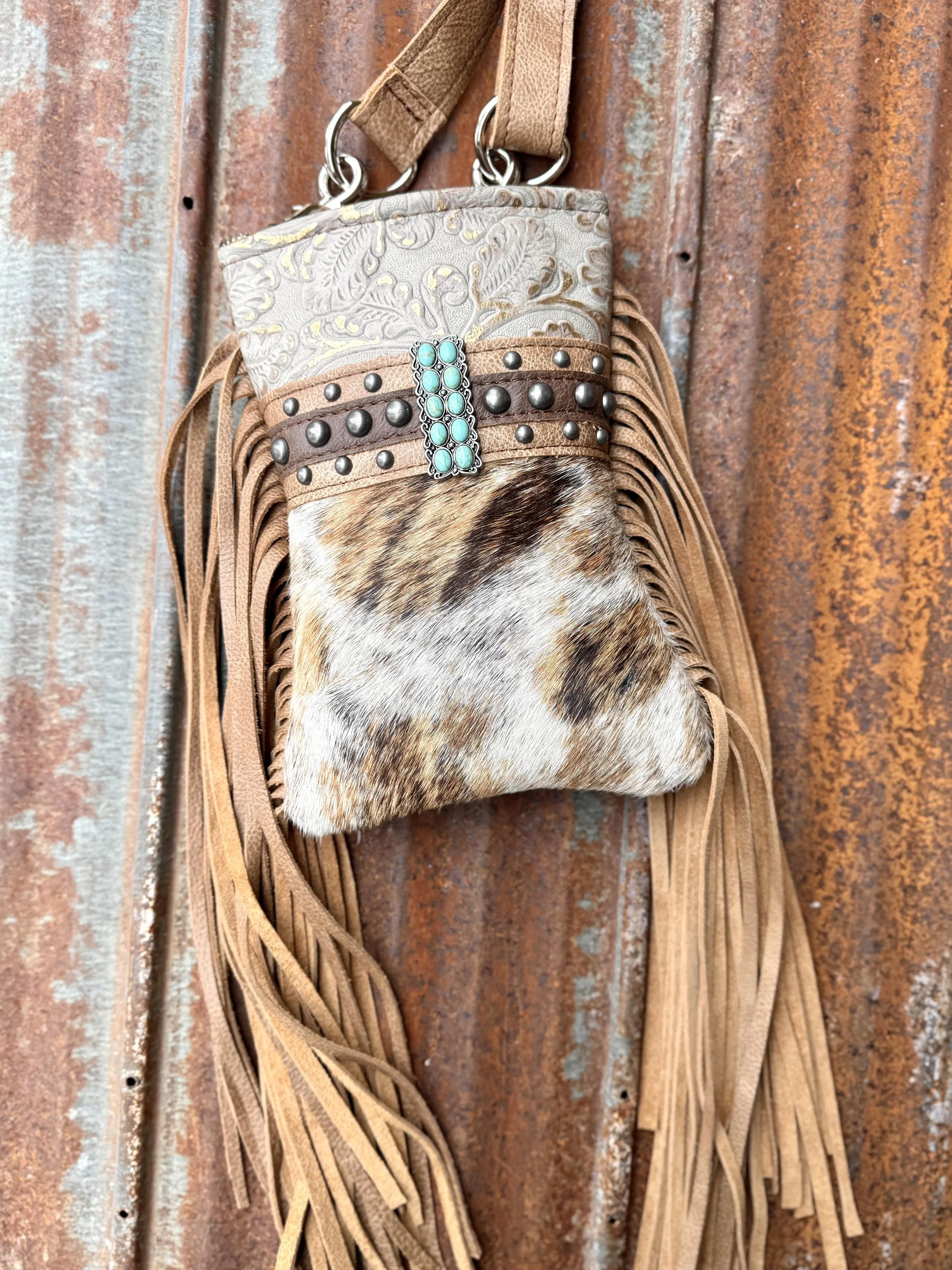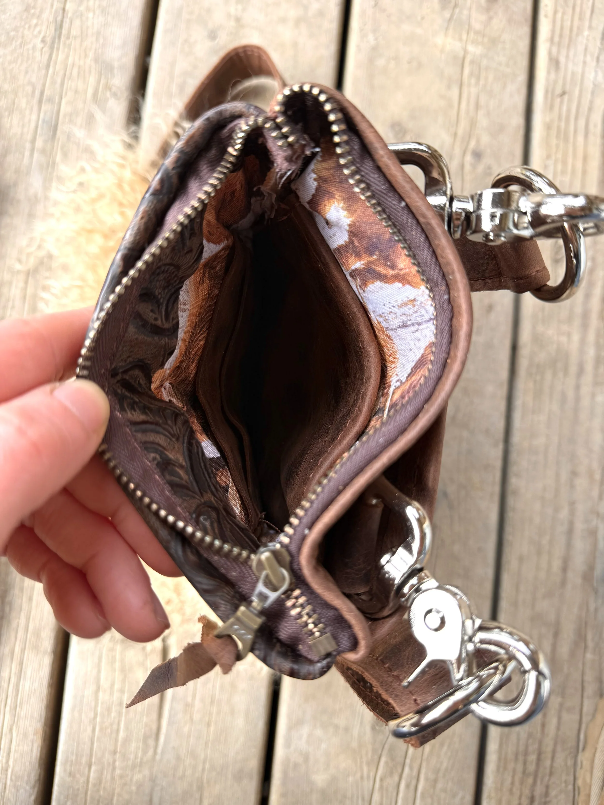 Wear her three ways! As a crossbody, attached to your belt loops OR attached to the back D ring of your saddle !